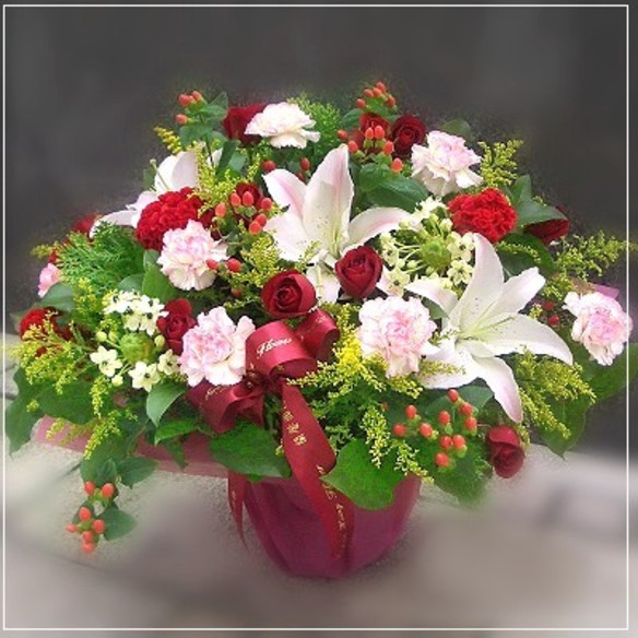 主要花材 花 材:滾邊進口康乃馨 百合 紅玫瑰 伯利恆之星 葉材 規 格:50x40x40 精心的花卉設計與祝福,適合生日禮物.情人花禮.、祝賀、好友、結婚、父親節、或母親節的最佳選擇